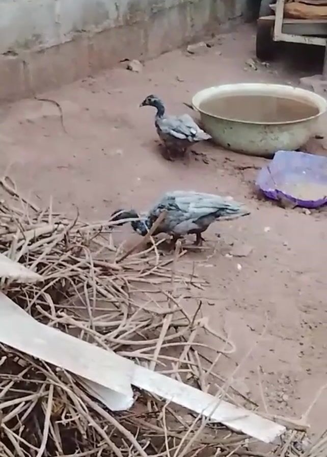 The scene captures two ducks in an outdoor environment. The ducks are grey and white with black heads and are moving on a dirt surface. In the background, there's a white wall, a metal basin filled with water, a purple plastic container, and a small wooden cart. In the foreground, there is a pile of dry sticks and white boards. The video focuses on the ducks as they wander around the outdoor area.