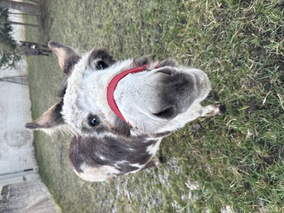 The image captures a scene in Olingen, Luxembourg. Two donkeys are present within a grassy outdoor enclosure. The primary subject, a piebald donkey exhibiting white and dark brown patches, is positioned centrally in the foreground, facing directly towards the camera. A red halter is fitted around its muzzle, and its eyes are open and directed forward. In the mid-ground, to the right, a second donkey, darker grey or brown in coloration, stands facing right, partially obscured. The ground surface consists of green and dried brown grass, indicating natural terrain. A light-colored concrete or stucco wall forms the left background boundary, while evergreen trees are visible along the right background perimeter. Natural daylight illuminates the scene.