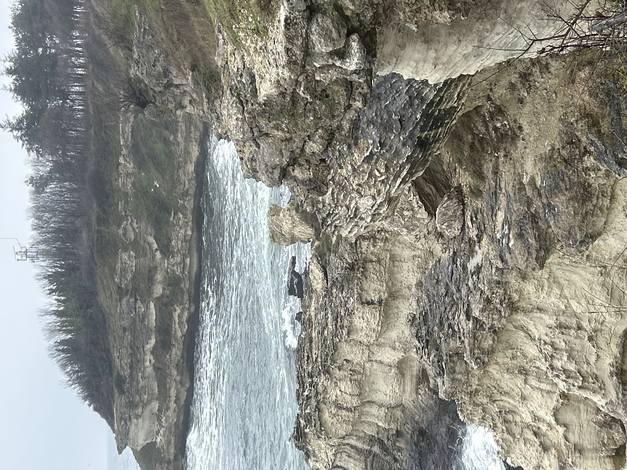 The image presents a coastal scene at Tsarevo, Bulgaria, showing rugged rock formations juxtaposed with the sea. The foreground is dominated by a light gray, layered rock face, displaying textures indicative of weathering and erosion. The sea, visible between the rock formations, appears gray and choppy, suggesting a windy or overcast day. On the opposite side of the water, a similar rock face supports vegetation, including trees and shrubs. A structure resembling a utility pole is visible at the top of the rock face on the left. The sky is overcast, contributing to the overall somber and gray tone of the image.
