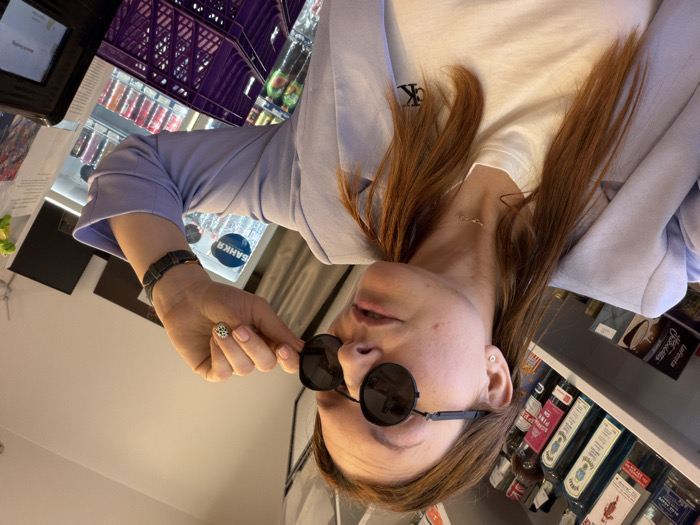 A woman, appearing to be in her 30s-40s with long, reddish-brown hair, is captured in a close-up, likely selfie-style photograph, inside a retail store in Sofia, Bulgaria