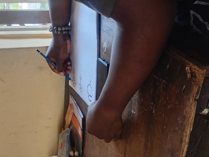 The scene, located in Ukukwa, Nigeria, depicts a person's hands and forearm positioned at a heavily worn, dark brown wooden desk. The dark-skinned right hand, adorned with stacked light-colored beaded bracelets, grasps a blue and black pencil, actively drawing a flower-like pattern on a white sheet of paper. Other simple line drawings, including cloud-like and organic shapes, are present on the paper. A dark smartphone rests face down on the paper, partially beneath the person's clenched left hand. To the left on the desk, a rectangular plastic case, rulers, and other flat objects are stacked. The background features a light-colored, stained wall and a window frame on the right, indicating an indoor setting with natural light.