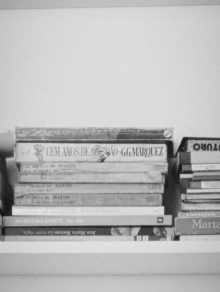 The scene is located in Iperó, Brazil. The image is a grayscale, eye-level photograph depicting a portion of a white bookshelf holding two vertical stacks of books against a plain white wall. The left stack, taller and wider, contains at least eight books. The top book is titled "CEM ANOS DE SOLIDÃO G.G. MARQUEZ" (One Hundred Years of Solitude by G.G. Marquez). Below it, "AS BRUMAS DE AVALON" (The Mists of Avalon) is visible, followed by "LA SENHORA DA" (The Lady of). Further down, "HAROLDO CONTI En vida" (Haroldo Conti In life) and "Ana María Matute La torre vieja" (Ana María Matute The old tower) are discernible. The right stack consists of several thinner books, with the partial title "ATURO" visible on the top book and "Marta" on the bottom book. Another book in the right stack is titled "A casa invencível" (The invincible house). No people, actions, or specific interactions are depicted. The environment is an interior space with a minimalistic wall and shelf design.