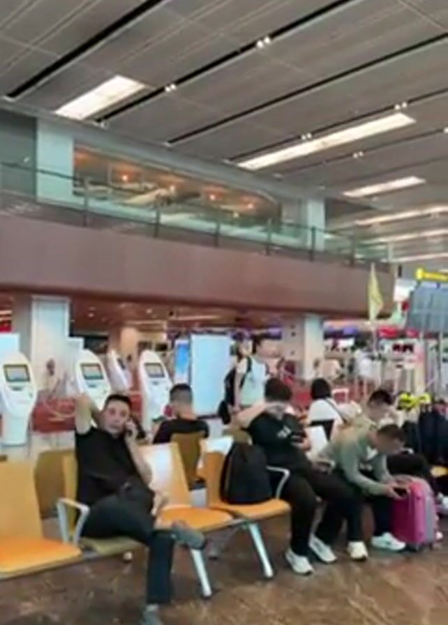 n airport waiting area filled with passengers. Some are seated on rows of orange chairs, while others walk by with luggage. A man in a black outfit talks on his phone while seated. A woman wearing a hijab and holding a drink walks past the seated group. The scene is brightly lit, showcasing the modern airport interior with a high ceiling and check-in kiosks in the background. The overall atmosphere is that of a busy airport terminal.