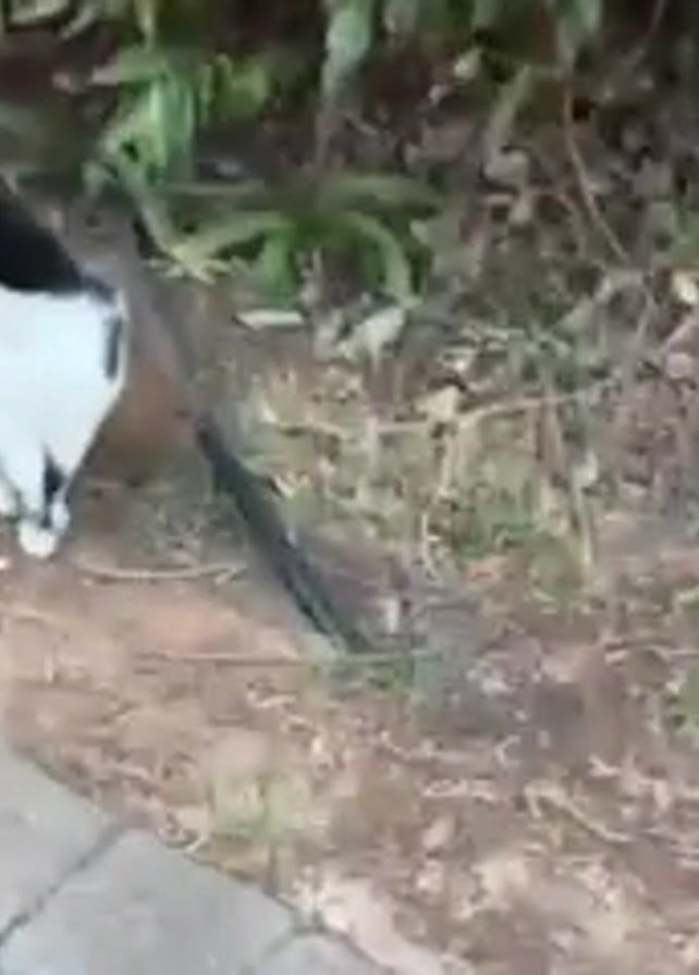 black and white cat sitting on the ground near a bush. The cat is sitting upright and looking at the camera. The cat meows at the camera. The ground is covered in dirt and leaves. There is a black hose lying on the ground. A stone curb runs along the left edge of the frame.