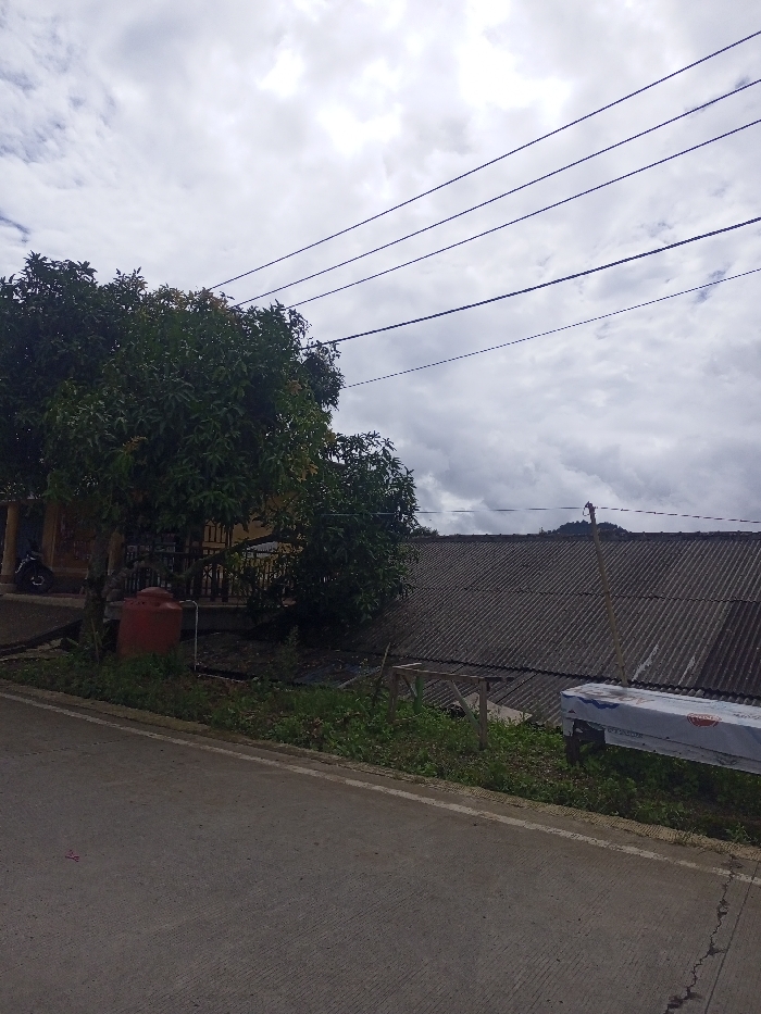 An overcast sky hangs above a landscape with trees beside a road. A red tank and a building are partially visible behind the trees. A gray corrugated roof dominates the middle ground. Power lines stretch across the sky. Vegetation grows along the roadside.