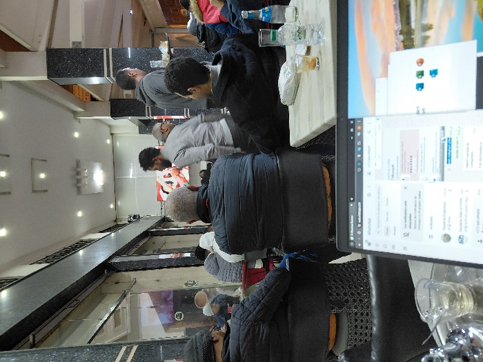 A blurred image shows several people standing indoors, seemingly in a shop or restaurant with a counter. Many wear coats and are looking down, possibly at food or items on display. A laptop screen is prominently in the foreground, displaying a web browser. A table with bottles and a glass is visible next to the laptop. The scene appears to be taken from a high angle, with the perspective tilted, making it slightly disorienting.