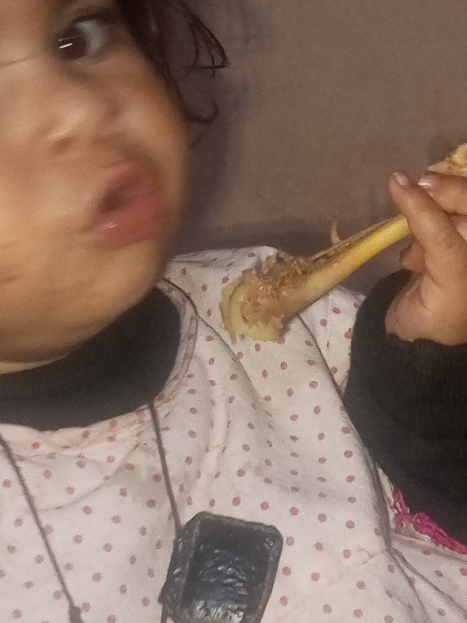 A young child, with dark hair, and dark eyes is holding a piece of sugar cane to their mouth. The child is wearing a light-colored shirt with red polka dots, with a dark colored sweater. A black object hangs from a necklace around the child’s neck. The background appears to be a solid light-colored wall. The location in the city of Mansehra, Pakistan is not discernible from the image.