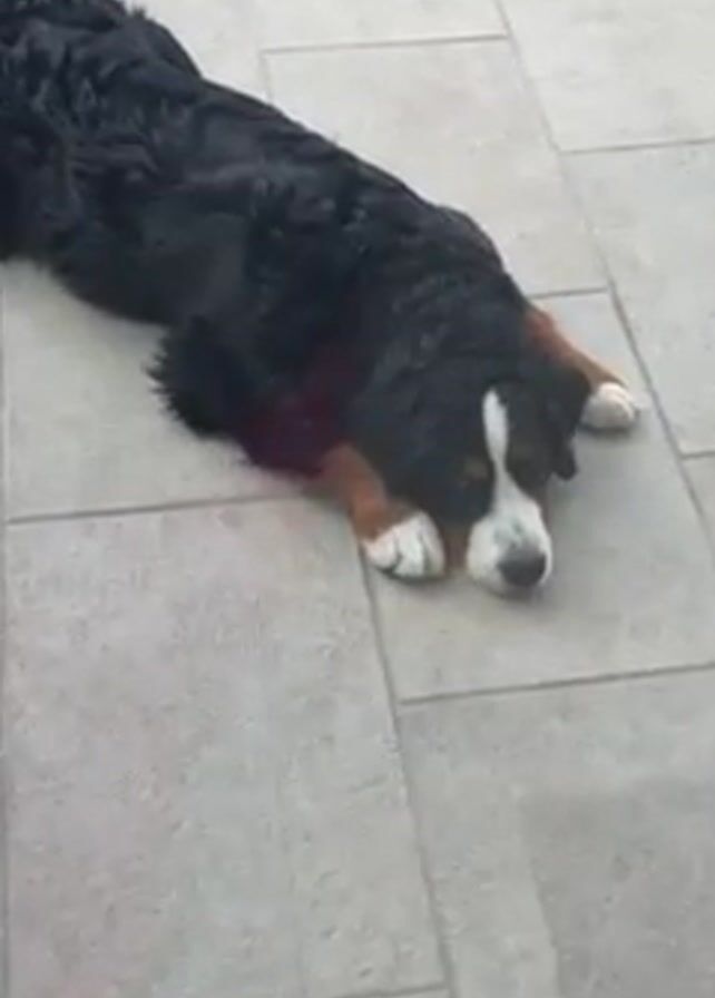A medium shot captures a Bernese Mountain Dog lying prone on a tiled floor. The dog has a black, brown, and white coat. It's lying with its front paws extended and its head resting on the floor. A person speaks in the background. The camera zooms in slightly on the dog. The tiles are light gray. A small square grate is visible in the background.