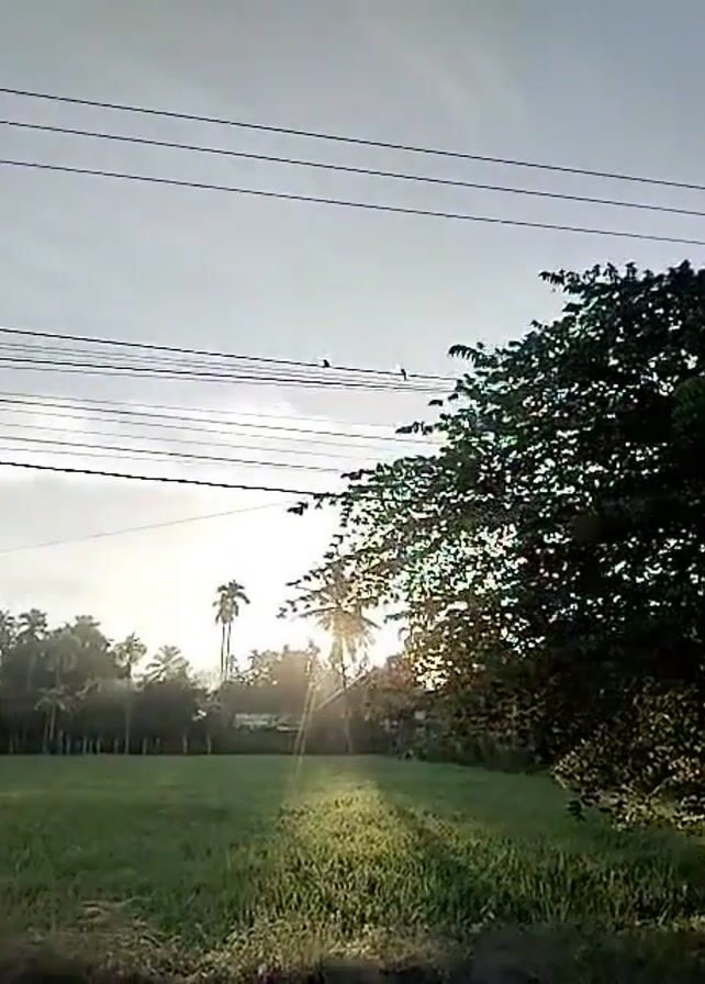 landscape scene with a field of green grass in the foreground. In the midground, there are trees, including palm trees, with the sun peeking through, casting a golden light. A small building is also visible in the distance. In the sky, there are several power lines running horizontally across the frame, with a few birds perched on them. The overall scene suggests a rural or suburban setting, possibly at dawn or dusk given the lighting conditions.