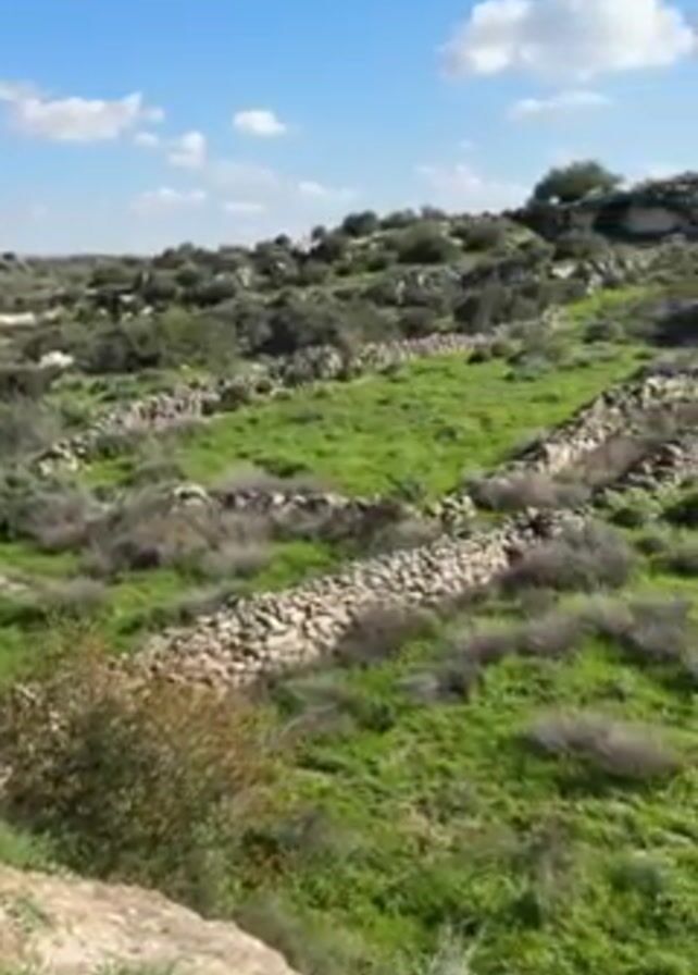 bright, grassy landscape on a sunny day with scattered clouds. The ground is uneven, with green grass and patches of brown shrubs. Numerous low walls made of piled stones run horizontally across the landscape, creating stepped terraces. In the background, there's a low cliff face with light-colored rock. The camera slowly pans right, revealing more of the landscape. Sounds of animal calls can be heard.