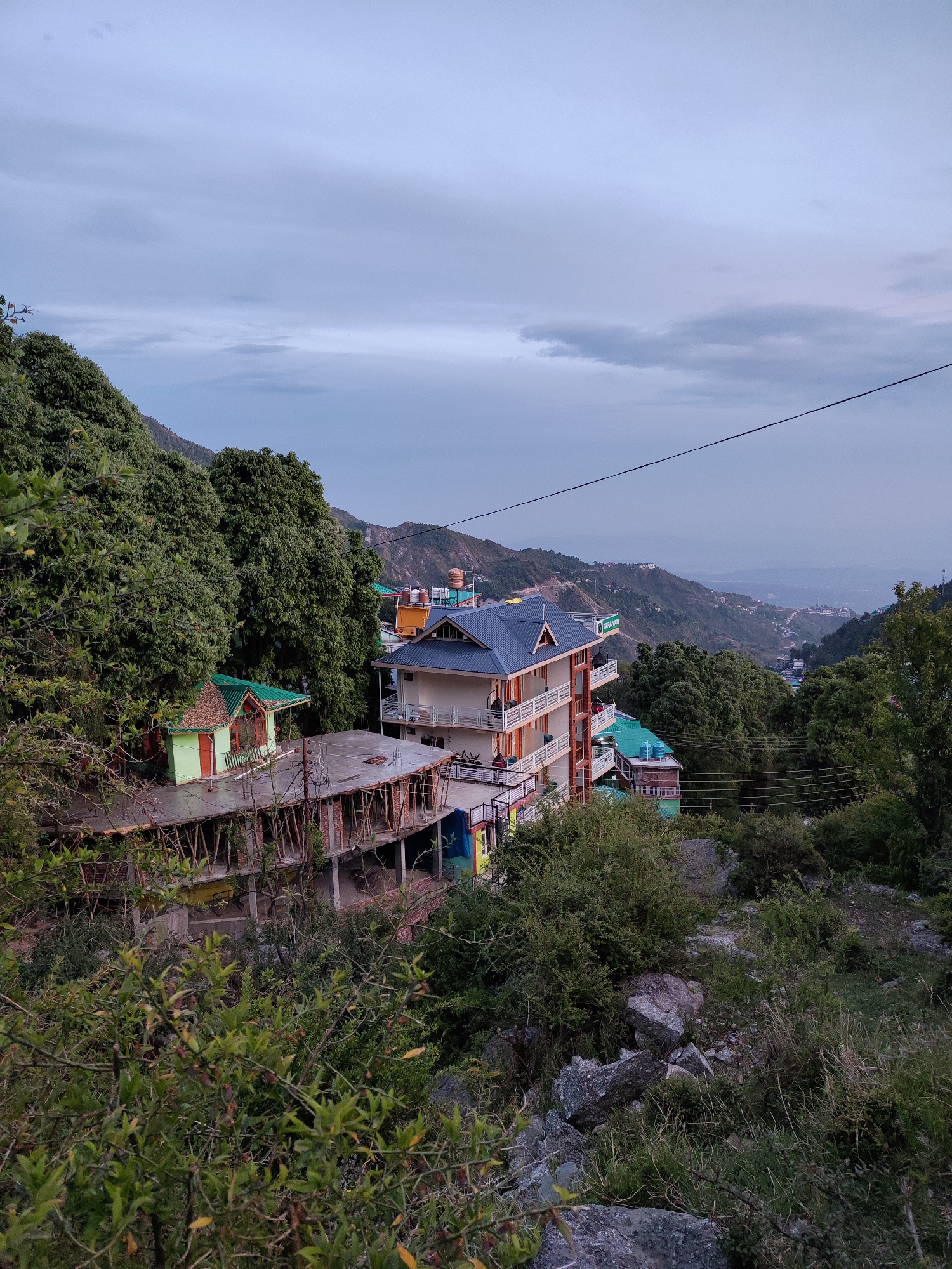 The image depicts a mountainous landscape in the vicinity of Haini, India. A multi-story building with a blue roof and balconies is centrally located. To its left, there is a smaller green-roofed structure and a building under construction with exposed supports. Lush green trees and vegetation fill the foreground and middle ground, partially obscuring the view. In the background, a distant cityscape is visible amidst rolling hills and a cloudy sky. An overhead wire bisects the upper portion of the frame. The ground consists of rocks and wild vegetation.