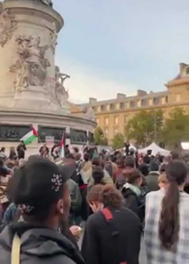 The video depicts a large crowd of people gathered in a public square, likely in a city. A prominent monument stands in the background, and several Palestinian flags are visible being waved by participants. The crowd appears to be engaged in a demonstration, as chants can be heard. The architecture surrounding the square includes a large building with multiple windows and a classic design. The sky is overcast, suggesting it may be late in the day. The crowd consists of individuals of various ages and appearances. Many are looking towards the monument, where individuals may be speaking or leading the demonstration.