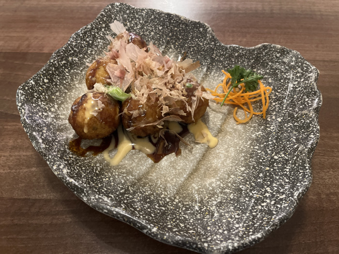 A close-up shot features a serving of six golden-brown takoyaki (octopus balls) presented on a speckled grey and white ceramic plate with an irregular, wavy edge