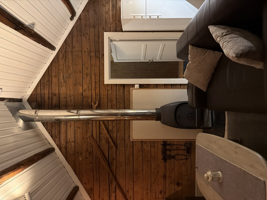 The room has rustic wooden walls and a white, angled ceiling. A silver stovepipe extends from the base of a black wood-burning stove. Nearby, a brown leather sofa has two beige pillows. In the background, a partially open white door is set in the wooden wall. A white cabinet sits above the door. To the right of the stove, a round table with a neutral-toned runner holds decorative items.