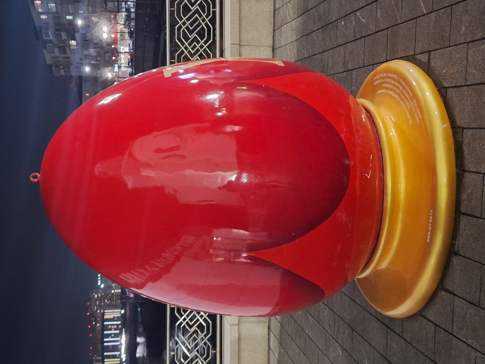 - "A large, glossy red, egg-shaped sculpture stands prominently at night on a dark grey paved surface, likely a promenade or square" by FM-UmrtH2, licensed under CC BY 4.0