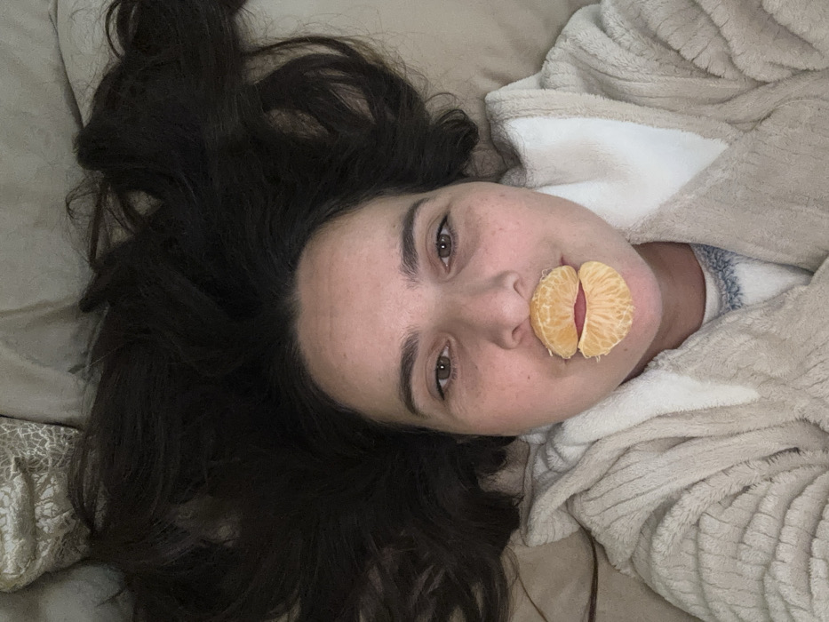 The image displays an overhead close-up of an adult female lying supine on what appears to be a bed. Her dark brown hair is fanned out around her head against light-colored bedding. She has light skin with visible freckles and brown eyes, looking directly at the camera. Two segments of a peeled mandarin orange are positioned over her mouth, creating the appearance of exaggerated, parted lips. She is wearing a light-colored, possibly cream or beige, textured bathrobe over a white garment with a subtle blue pattern. The immediate environment consists of her hair and the bedding. There is no visual information within the image to specify the location as Meknes, Morocco, or any other particular geographical site.