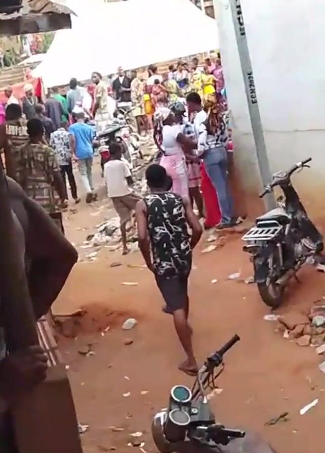 n outdoor scene, likely a street, with a crowd of people gathered in the background. The ground appears to be dirt or packed earth, and there's scattered litter. Several motorcycles are parked in the immediate foreground. The camera is positioned behind some wooden supports, possibly a building or shelter. In the foreground, several people are visible, and one person is wearing a white tank top and yellow shorts. The crowd in the background is loosely gathered under a white tent. The atmosphere seems busy and lively.