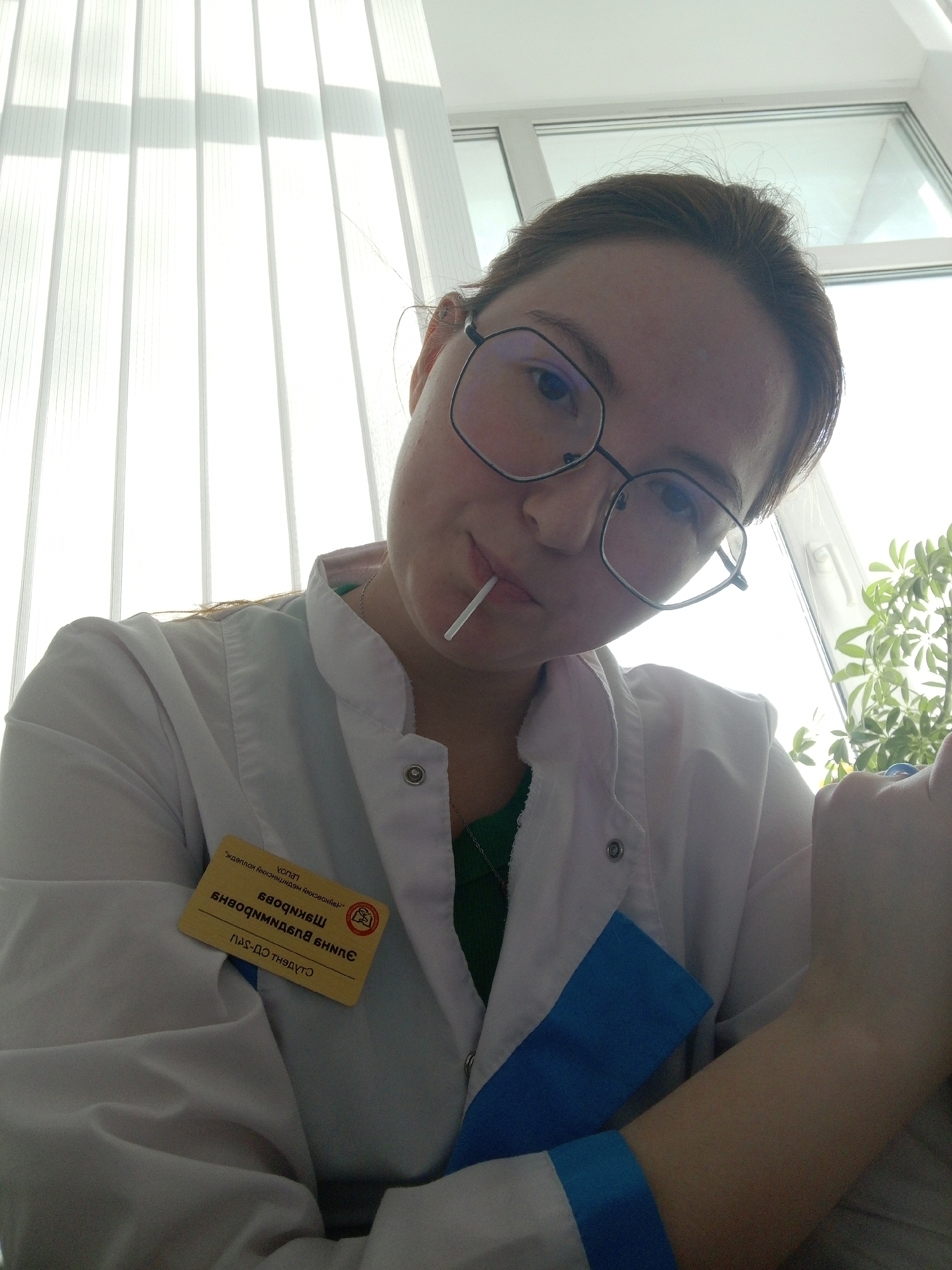 A young female individual is captured in a close-up, low-angle indoor photograph. She wears large, dark-framed eyeglasses and a white lab coat with blue accents on the sleeves, over a green undershirt. A yellow identification badge, inverted but legible, is pinned to her left lapel, identifying her as "Enne Vladimirovna Shamshurina, Student" of "Chaikovsky Medical College." A white lollipop stick is held between her lips. The background features bright windows with white vertical blinds, creating prominent vertical shadows. To the right, a green leafy plant is visible through a window. The scene is located within the Chaikovsky Medical College in the city of Chaikovsky, Russia.