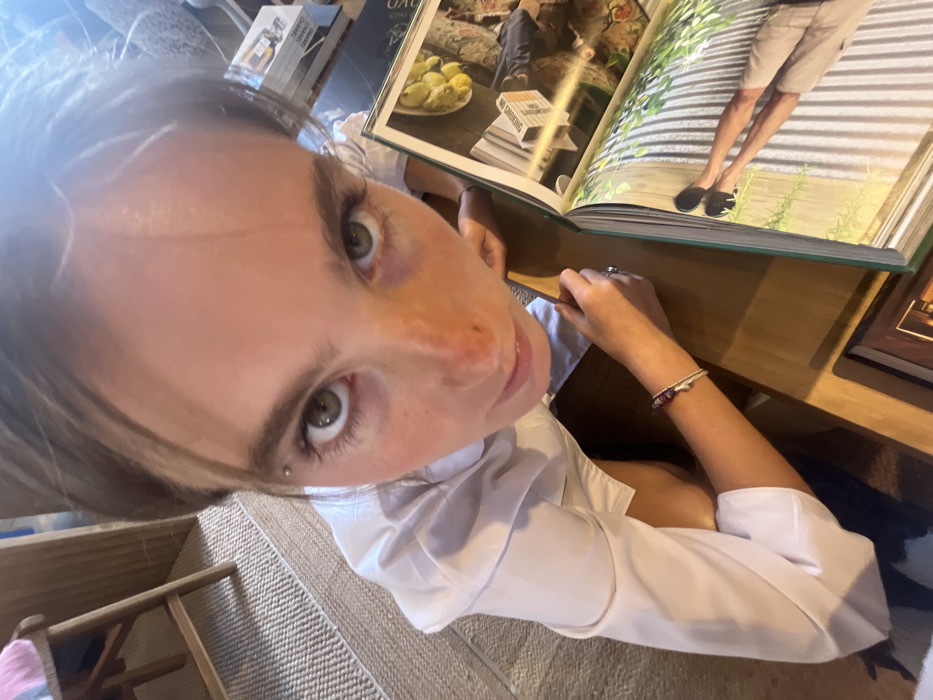 An angled close-up photograph captures a young woman with striking green eyes and fair skin, accented by a freckled nose. She gazes upwards towards the camera. A white, button-down shirt adorns her torso. Her right arm is visible, featuring a delicate bracelet and a ring on her ring finger. To her right, a large, open book rests on a wooden surface, displaying images of a lemon arrangement, a stack of books, and a person in shorts. The background includes glimpses of other books and a woven rug.