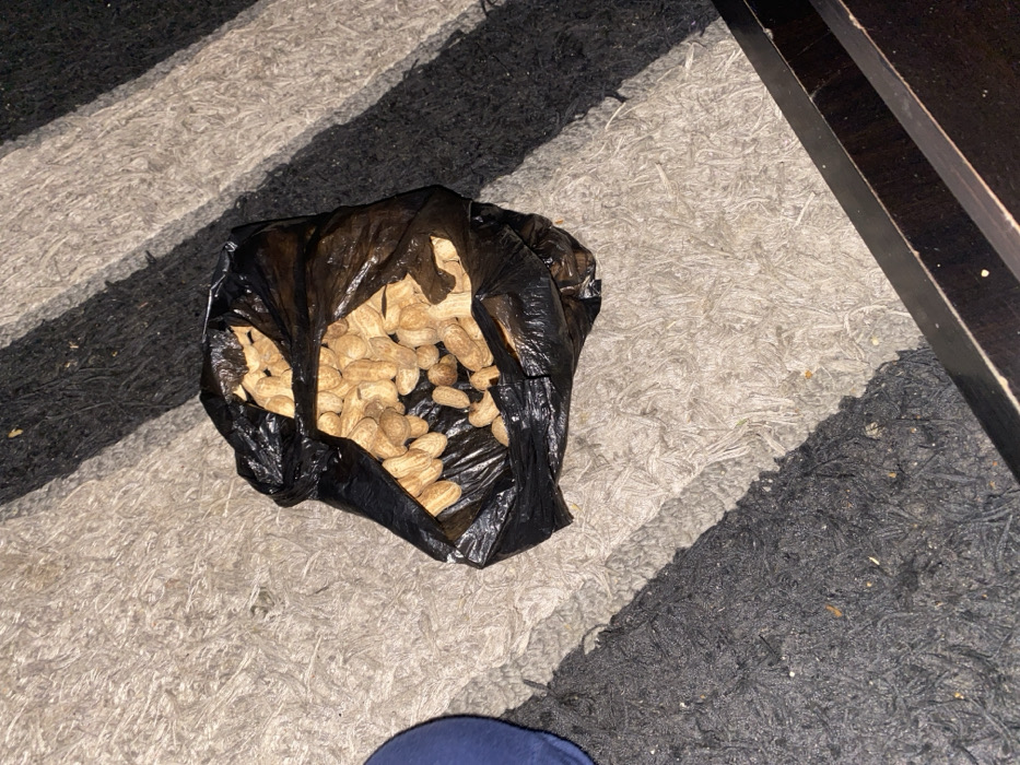 A black plastic bag, partially open, contains an estimated 50-70 unshelled peanuts