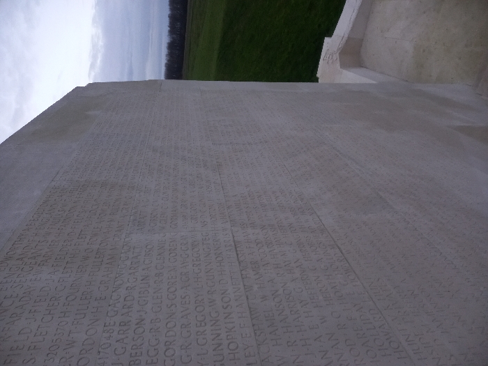 stone memorial engraved with names. The names are arranged in columns, likely alphabetical, and include surnames like "ORTHY," "FARADAY," "FLETCHER," and "FOURNIER." Other names include "GARRARD," "GIBLIN," "GLEN," "GRAVES," and "GUNNING." Some entries appear to have initials or rank before the surname. The names are etched into the stone's surface, and the memorial is positioned against a backdrop of sky, greenery and a structure.
