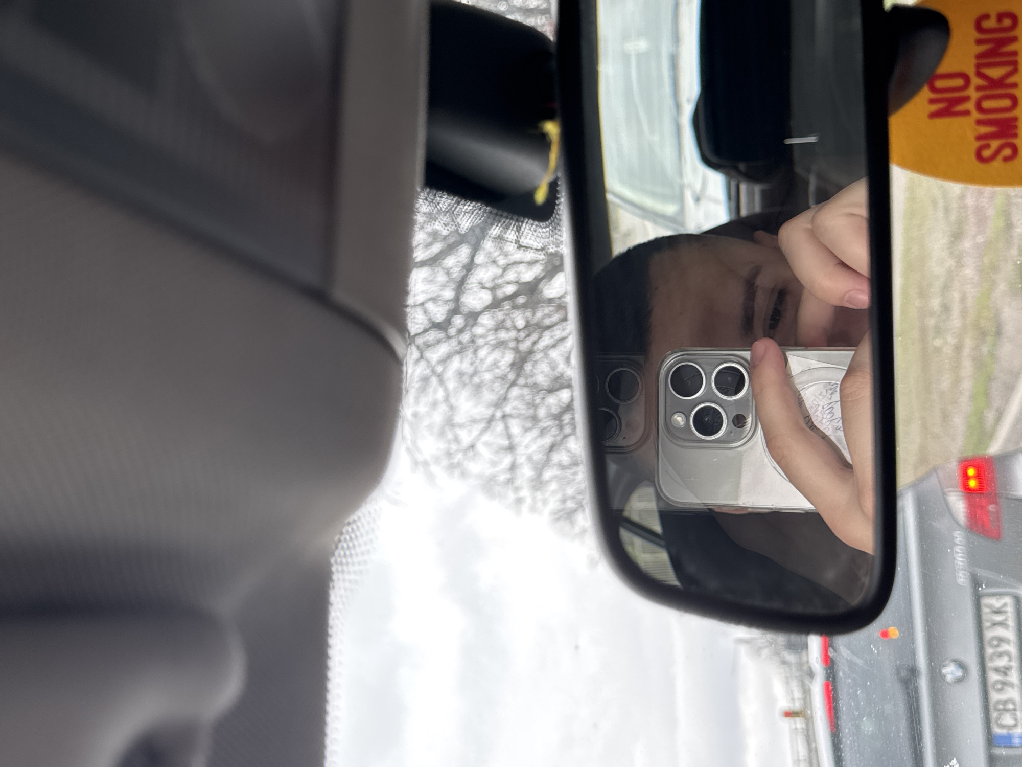 reflection in a car's side mirror. A person is taking a photo of themselves with a smartphone in the mirror. The license plate of the car behind is visible: CB 9439 XK, indicating that the location is likely Sofia, Bulgaria. A "NO SMOKING" sign is also visible. The environment outside the car appears to be an urban area with trees.