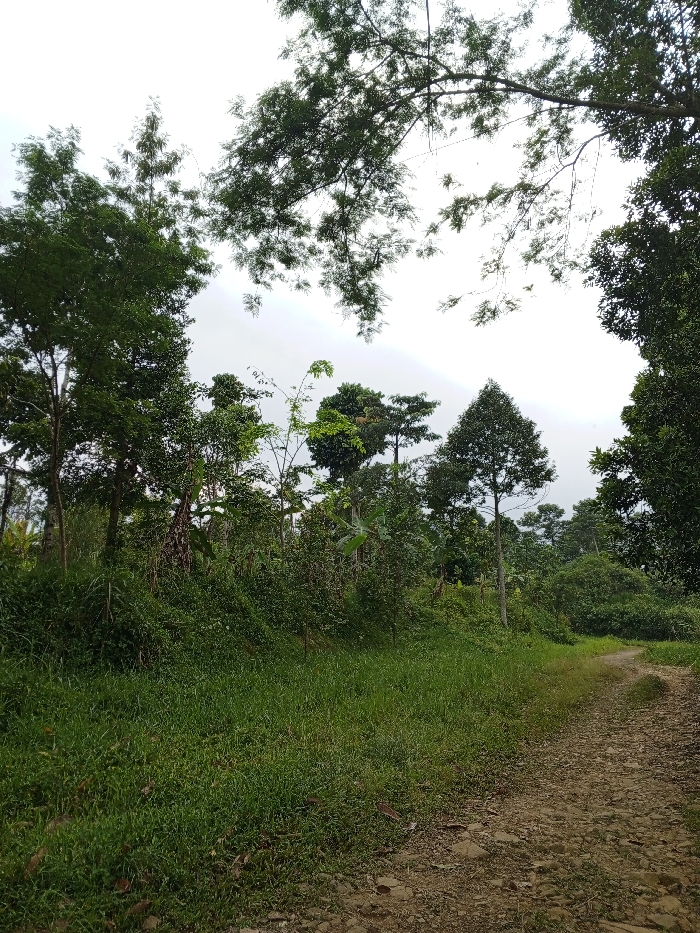 The image displays a verdant, undeveloped area in Thotagamuwa, Sri Lanka, under an overcast sky. A winding dirt path, composed of light brown soil and small stones, originates from the lower right foreground and curves into the midground, disappearing among dense vegetation. To the left of the path, the foreground is covered in bright green grass and low-growing plants. Beyond the grass, a thick assembly of various trees and shrubs, displaying a range of green foliage, occupies the midground and extends into the background, forming a dense natural barrier. Notable vegetation includes taller trees with dark green canopies and plants exhibiting large, banana-like leaves. Overhead, branches with numerous green leaves partially obscure a uniformly light gray sky. No individuals, animals, man-made objects other than the path, or actions are depicted.