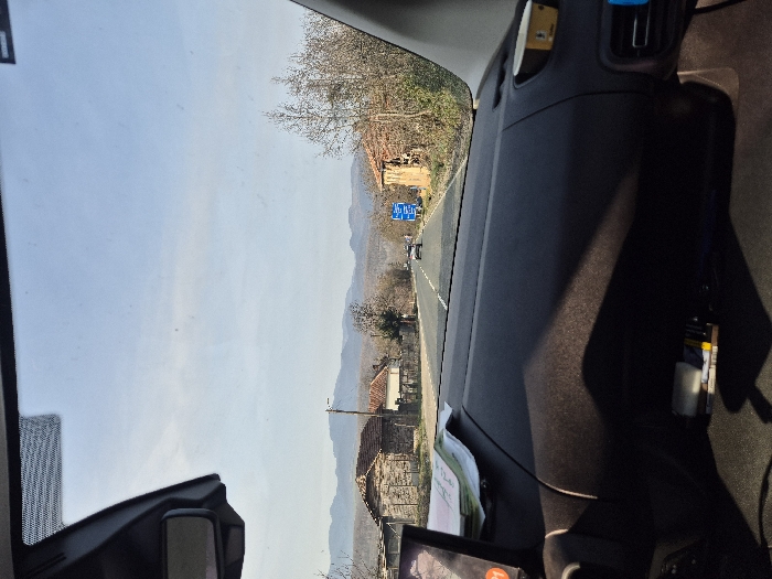 A frontal view from inside a vehicle displays a two-lane asphalt road extending into the distance under a clear blue sky. The scene is located in the city of Sopot, Bulgaria. The foreground shows the dark-colored dashboard of the vehicle, partially illuminated by sunlight. On the left side of the dashboard, a dark electronic device with a screen is mounted, with white papers stacked beneath it. Below the dashboard, a storage compartment contains several small objects, including a white cylindrical item and a dark case. On the right side, a light brown paper cup rests in a cup holder, next to an air vent. A portion of the vehicle's A-pillar is visible on the far right. The road features a broken white center line and a solid white line on its right edge. On the left side of the road, a two-story house with a reddish-brown tiled roof and light-colored walls stands, enclosed by a fence, surrounded by bare deciduous trees. Further down the road on the left, parts of another structure are visible. On the right side of the road, a dilapidated brick building with an orange-tiled roof is situated among bare trees and shrubbery. A utility pole is visible on the left. In the mid-distance, a blue rectangular road sign is present on the right side of the road. Two passenger vehicles are observed on the road ahead, traveling away from the viewer. The background features a range of distant mountains under a bright, slightly hazy sky. No individuals are visible within the frame.