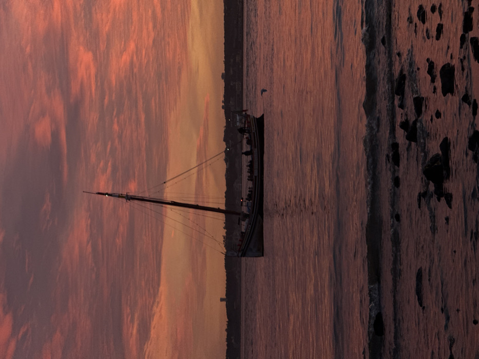 A side-view shot captures a tall ship, possibly a schooner or brigantine, sailing on calm water during a vibrant sunset