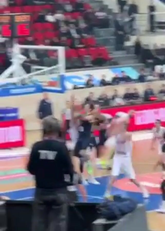 The video captures a basketball game inside a well-lit indoor stadium with red seating and a crowd