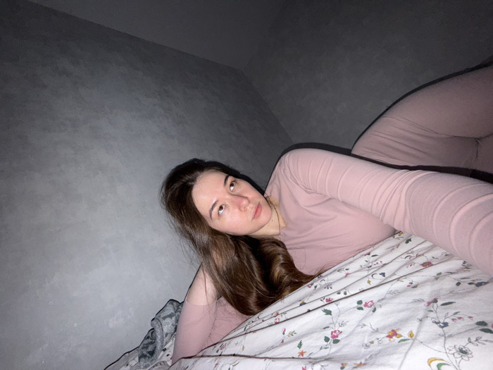 A young female, appearing to be in her twenties with long, dark brown hair, is lying on a bed in an interior room located in Chaikovsky, Russia