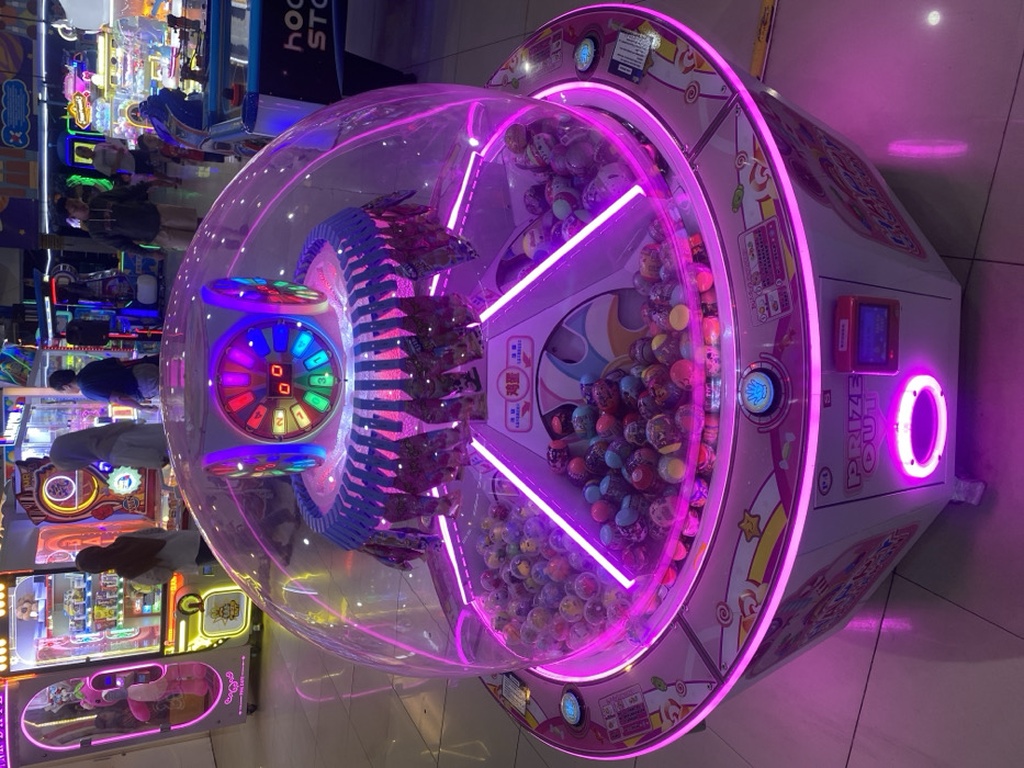 The scene depicts an interior view of an arcade, specifically located in Kecamatan Pati, Indonesia. The primary subject is a large, multi-component prize redemption or capsule game machine prominently situated in the foreground. This machine is predominantly white, featuring extensive pink and purple neon lighting accents on its base, rim, and internal structure. A transparent spherical enclosure tops the machine, revealing its internal mechanisms. Within the transparent dome, a central rotating element at the apex displays a multi-colored segmented light wheel and a digital readout currently showing "0." Beneath this, a circular array of numerous individually packaged prizes, possibly snacks or small toys, are suspended from hooks. The lower section of the machine's interior contains multiple compartments filled with diverse, colorful spherical capsules. The front-facing portion of the machine's base displays the text "PRIZE OUT" and incorporates a prize dispensing slot. A blue button with a hand symbol is visible on the upper surface of the machine's perimeter. The background shows a brightly lit, active arcade environment. Several other arcade machines, characterized by their bright lights and varied designs, are visible. Multiple individuals are present in the background: a person wearing a brown hijab is interacting with a game on the left, another individual in a light-colored hijab and a person in a dark shirt are standing near other machines further back, and a person in a dark hoodie is walking in the middle distance to the right. The floor is a light-colored, reflective surface, likely polished tile or linoleum. No direct interaction with the foreground machine is depicted.