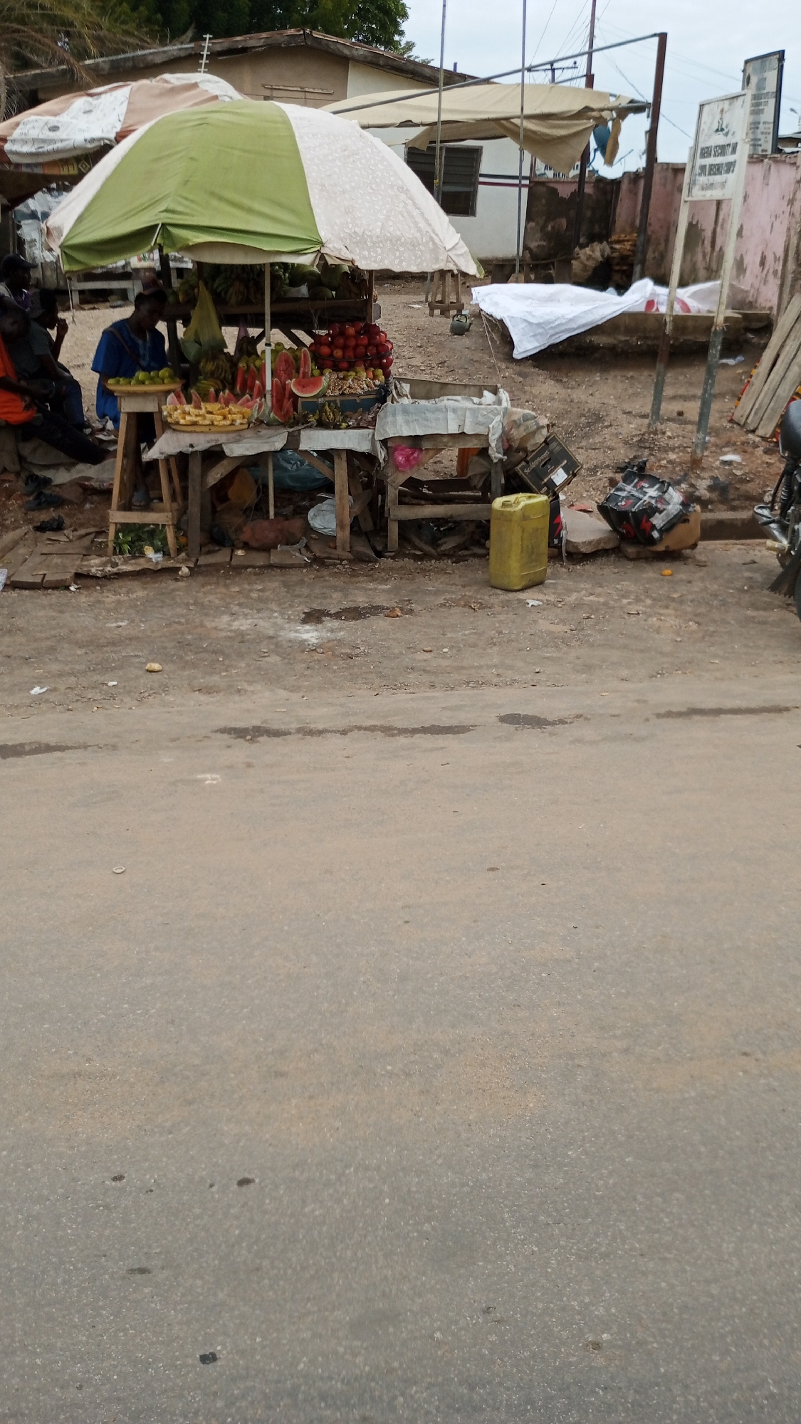 The image depicts a fruit stand in Zango-ndaji, Nigeria. A makeshift table displays watermelons, bananas, pineapples, and other fruits under a green and white umbrella. Two men sit nearby, one wearing a blue shirt. A yellow jerrycan sits near the table. A motorcycle is partially visible to the right. In the background is a white sheet and a sign. The foreground shows a paved road.