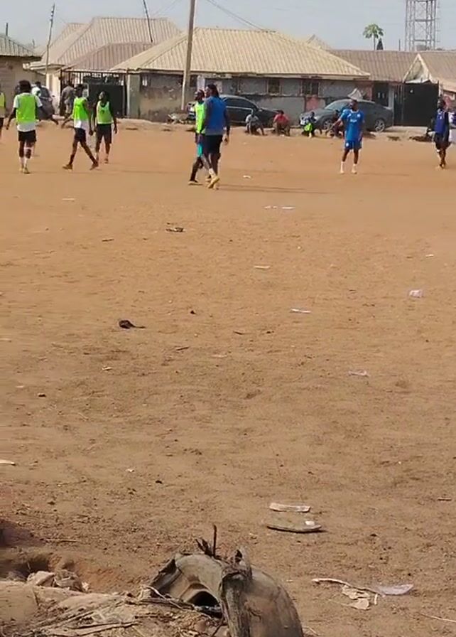 soccer game in progress on a dirt field. Several players wearing green vests and blue jerseys are actively running and kicking a soccer ball. In the background, there are houses with corrugated metal roofs and a water tower is visible. In the foreground, there is a pile of debris, including old tires and trash. The weather appears to be overcast.