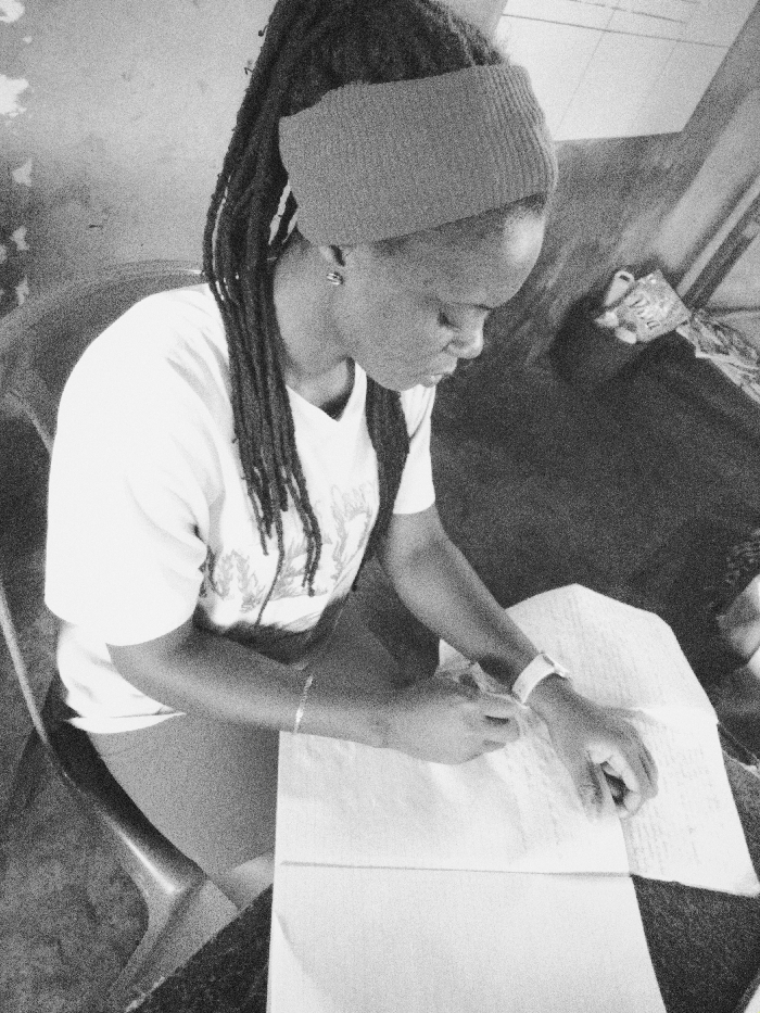The black and white image displays a female individual seated at a dark-surfaced table indoors, located in Ukwu-Abwa, Nigeria. She is positioned in profile, facing downwards and to the right, actively writing or drawing on multiple sheets of paper with a writing utensil held in her right hand. Her hair is styled in dreadlocks, secured by a light-colored, ribbed headband. She wears a light-colored short-sleeved t-shirt featuring a dark graphic design, dark shorts or a skirt, small stud earrings, a thin bracelet on her left wrist, and a wider, light-colored band on her right wrist. The paper in front of her contains visible handwritten text or markings. To the right of the individual on the table, an object resembling a crumpled snack wrapper is present. The background shows an indistinct indoor wall or surface.