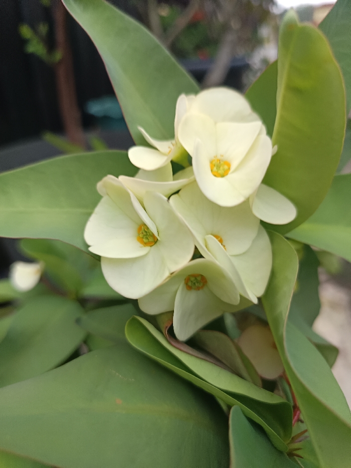 - "A close-up, high-angle photograph depicts a cluster of creamy white Euphorbia milii (Crown of Thorns) flowers and foliage" by FM-78kfH2, licensed under CC BY 4.0