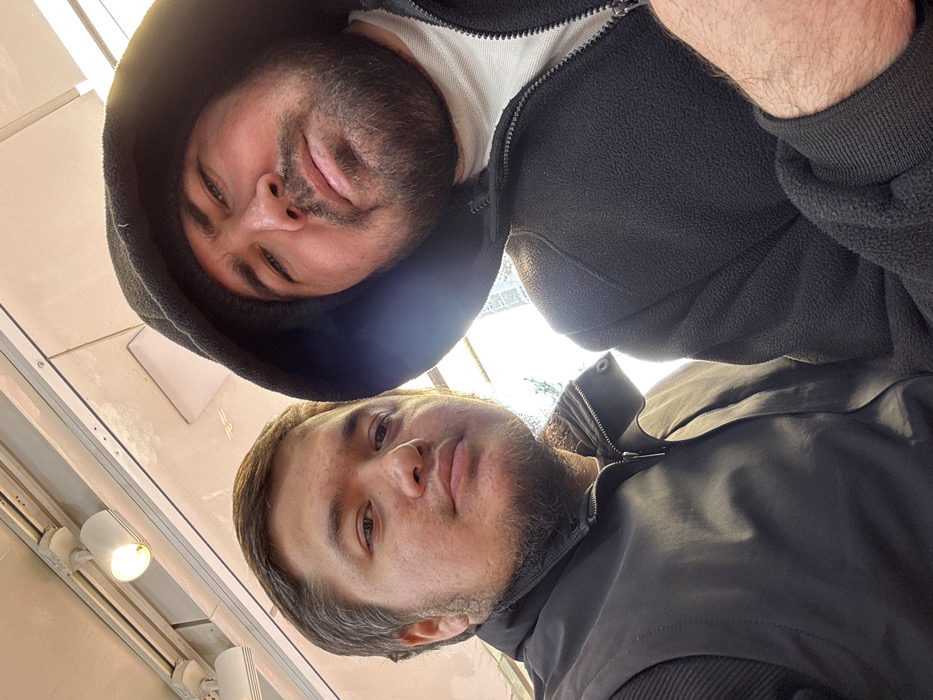Two men pose for a selfie-style shot. The man at the top wears a black hooded sweatshirt. His eyes are closed, and he is smiling slightly. The man at the bottom looks at the camera with a neutral expression. He wears a black vest and a black turtleneck shirt underneath. The background includes a white ceiling with a light fixture. The overall image has a slight tilt.
