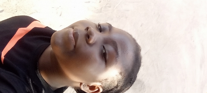 A dark-skinned person with short, dark hair lies angled on a light-colored, textured surface