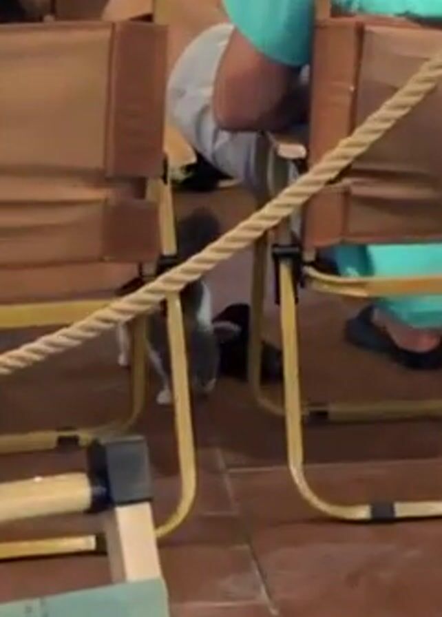 gray and white kitten sitting beneath a row of chairs at what appears to be an outdoor restaurant or cafe. The chairs are yellow framed with brown canvas backs and seats. A rope barrier is visible between the chairs. Several people are seated at the chairs, but their faces are not clearly visible. The floor is paved with reddish brown tiles. The kitten is licking its paw and grooming itself.