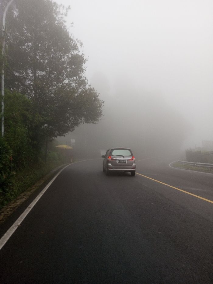 The image depicts a foggy road scene in Ariyalai, Sri Lanka. A light brown or grey minivan is observed from the rear, proceeding away from the viewer in the right lane of a dark asphalt road. The road features a double solid white line marking the left edge and a solid yellow line separating the traffic lanes. Dense green foliage and a large tree with dark leaves line the left side of the road. A utility pole is visible on the far left. Further along the left side, partially obscured by the mist, a yellow umbrella or canopy structure is present. The road curves gently to the right, where a metal guardrail or barrier is partially visible through the heavy fog. The pervasive fog severely limits visibility, rendering distant objects and the sky a uniform light grey. No individuals are clearly visible within the frame. The minivan's license plate is present but unreadable.