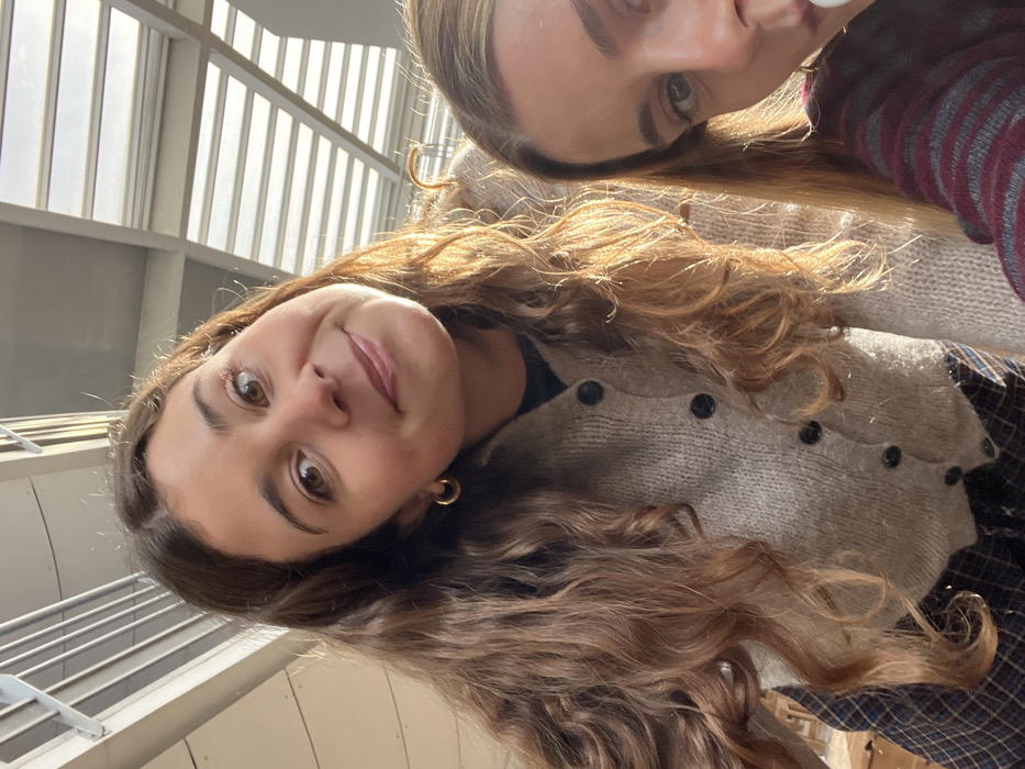 Two individuals are depicted in a close-up, upward-angled photograph taken indoors. The primary subject, a female positioned on the left, has long, wavy brown hair and brown eyes, looking directly at the camera with a slight smile. She wears small gold hoop earrings, a light beige knitted cardigan with dark circular buttons, and a dark garment underneath. A dark plaid skirt is partially visible below the cardigan. The secondary subject, partially visible on the right, shows only the right side of her face (nose and mouth area) and shoulder. She appears to have lighter hair and is wearing a dark red garment with horizontal grey stripes. A white cylindrical object is positioned near her mouth. The background features a modern indoor ceiling structure with exposed light-colored beams forming a grid pattern, beneath what appears to be a skylight or large translucent panels allowing natural light to illuminate the scene. The specific location within Porto Salvo, Portugal, is not discernible from the visible architectural elements, but the environment suggests a contemporary public or commercial building.