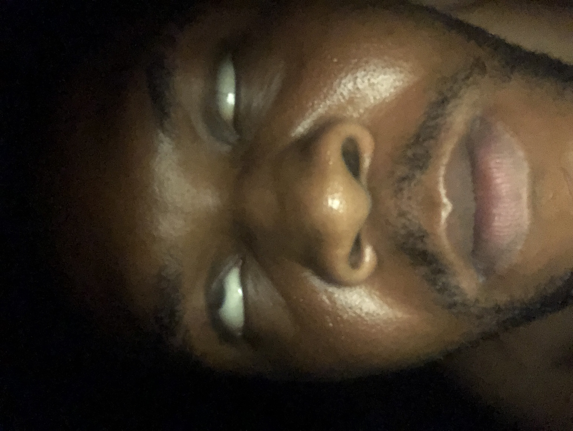 A close-up, slightly angled view of a person's face. The subject has dark skin, a short beard, and appears to be looking upwards with open eyes and mouth. The setting is dark and indistinct, providing no indication of location.