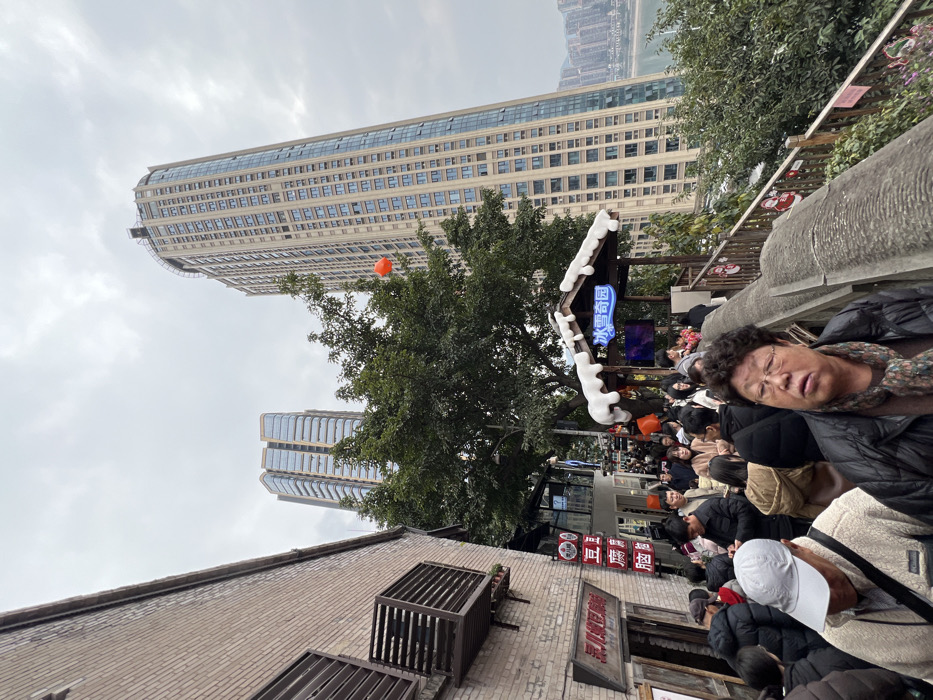 A candid shot captures a crowd seemingly waiting in line. In the foreground, an elderly woman sleeps, seemingly oblivious to the activity around her. A brick building with an air conditioning unit is visible. Above, a towering modern skyscraper reaches into the cloudy sky. A large green tree and a sign with what looks like snow decorations add a touch of nature. An orange balloon is among the tree. The orientation of the image is rotated 90 degrees.
