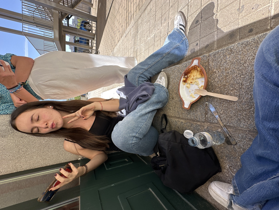 An urban outdoor scene in Madrid, Spain, is depicted on a bright, sunny day. In the immediate foreground, the legs of a person wearing blue jeans and white sneakers are partially visible. A young female, positioned centrally, sits on a stone curb, leaning against a dark green painted architectural element. She has long brown hair, wears a black tank top and blue jeans, and has a grey sweatshirt draped over her left leg. Her eyes are closed, lips puckered, and her left hand displays a peace sign, while her right hand holds a smartphone. Both hands have dark red nail polish. She wears white and grey sneakers. On the paved ground beside her, a black fabric backpack, an open plastic water bottle, a metal knife, and a wooden fork are arranged. Adjacent to these items is a terracotta-rimmed ceramic dish containing the remnants of a partially consumed savory pie or quiche. Behind the seated female, the lower torso and legs of a second person are visible, standing, dressed in a patterned blue and green top and white loose-fitting trousers, holding a white object. In the background, a modern architectural structure featuring grey metal railings and stairs, indicative of an elevated walkway or part of a transportation hub, stands against a clear blue sky. A blue car is parked in the distance near this structure, with other urban buildings faintly visible. The ground is paved with rough-cut stone slabs transitioning to rectangular pavers.