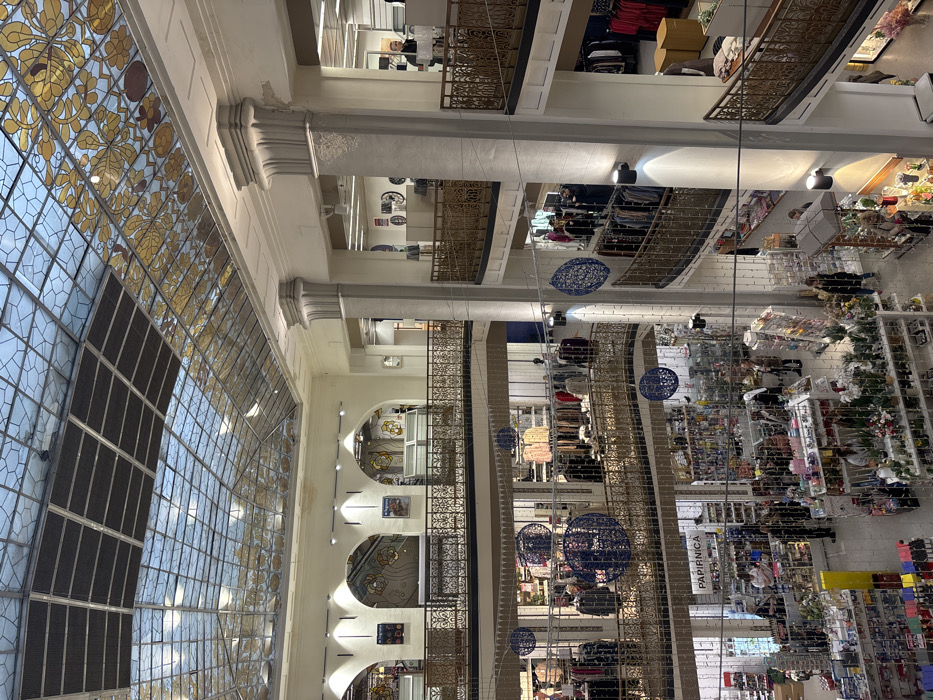 An upward perspective shows a multi-level department store