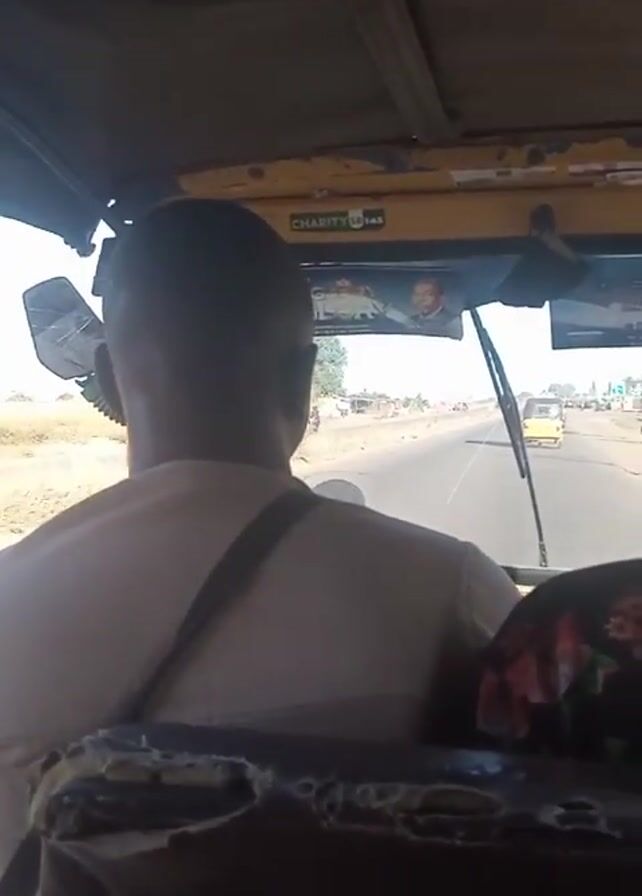 view from inside a yellow auto rickshaw, also known as a keke or tuk-tuk, traveling down a road. The driver, a man with a shaved head wearing a light-colored shirt, is visible from the back. A passenger, a woman with braided hair styled in a ponytail and wearing a dark floral-print shirt, is sitting next to the person recording the video. The vehicle is moving along a paved road, with buildings and vegetation visible in the background. There is another auto rickshaw visible in the distance ahead on the road. The windshield wiper is visible as is a dashboard sticker.