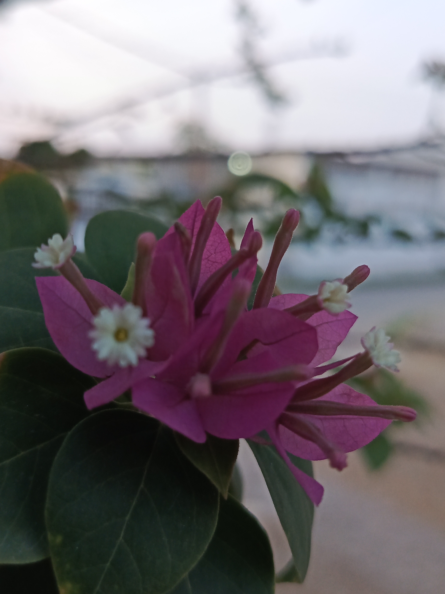 A close-up photograph captures a cluster of vivid deep pink (magenta) Bougainvillea bracts, centrally positioned and in sharp focus, displaying intricate venation. Embedded within these bracts are several small, tubular white flowers, each exhibiting a yellow center, extending outward. To the left and beneath the primary flower cluster, dark green, ovate leaves are partially visible, serving as a dark contrasting element. The background is significantly blurred, indicating a shallow depth of field. It depicts a soft, desaturated gradient of light blue-grey sky blending into lighter hues at the top, transitioning to indistinct shapes and muted tones in the mid-ground, possibly suggesting distant structures or vegetation. A distinct circular lens flare is present in the upper-left portion of the blurred background. The lower background is a lighter, indistinct blend of pale browns and greys. This outdoor scene is situated in the city of Tinaco, Venezuela. No human figures or discernible actions are present.