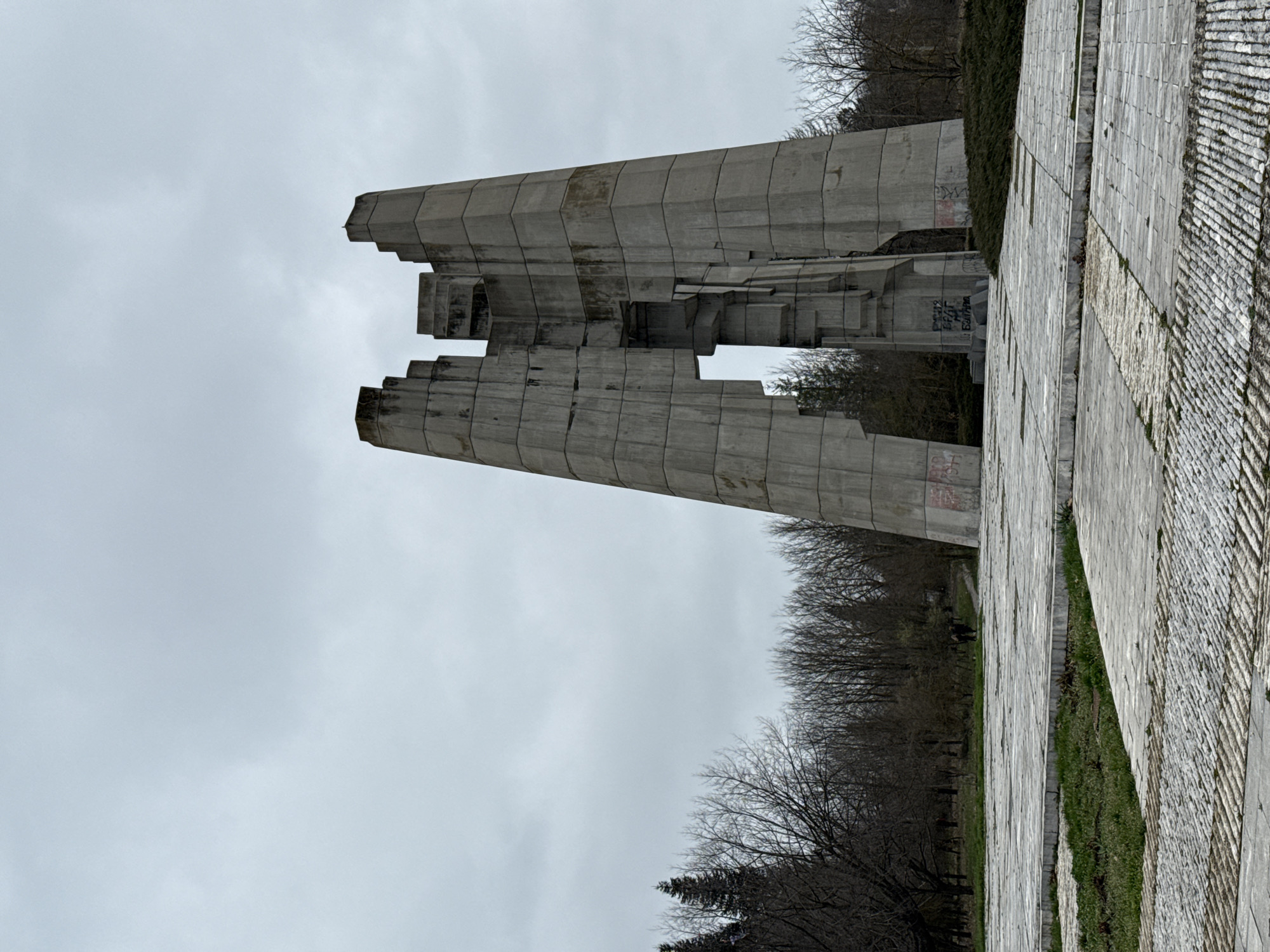 Monument of Freedom in Razgrad, Bulgaria. This brutalist concrete structure consists of two upward-pointing pillars with stepped edges, positioned against an overcast sky. Adjacent to the monument is a paved walkway composed of large rectangular stones and areas of smaller, patterned stones and grass. Trees, mostly bare, are visible in the background. Graffiti is present on the monument's surface.