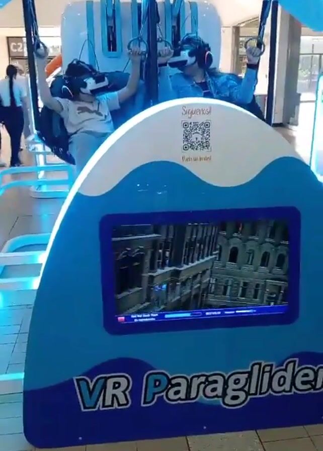 Two people are experiencing a VR paragliding simulator. They are both wearing VR headsets and are suspended in harnesses attached to a rig that simulates the sensation of paragliding. They are holding onto handles. The rig is surrounded by a blue and white structure labeled "VR Paraglider". A screen on the front of the structure displays the VR experience they are seeing. The setting appears to be a shopping mall. People are walking around in the background.