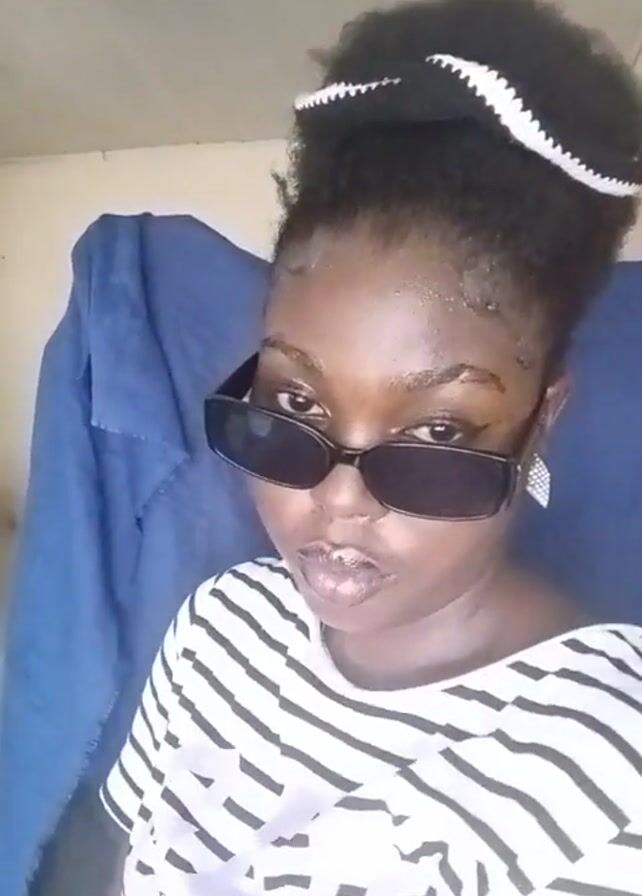 A young woman with dark skin and dark hair pulled up in a bun is posing for a selfie or video. She wears large black sunglasses and a black and white striped shirt. She has a white and black headband, and diamond-like earrings. Her lips appear to be glossed, and her expression is serious. She is sitting in front of a blue fabric. The background is blurry, showing a white ceiling with a light fixture. At one point she takes her glasses off and puts them back on.